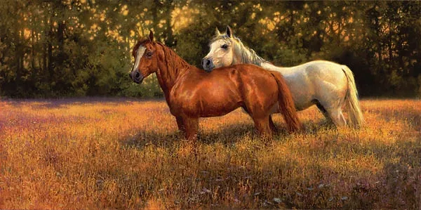 With Summer Fields we have a perfect example of such a Marris work. Warm summer winds are blowing the leaves and grasses. The sun heats the colors and edges until they blend into one another. Horses' tails swish and calmness blankets the field. They rest together, best buddies, massaging each other's backs and listening to distant breezes.