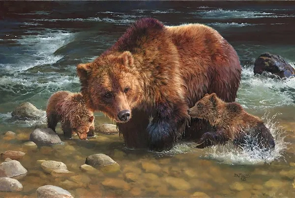 Bonnie Marris has taken an unusual path into art; she developed her talent by portraying animals "from the inside out." While she was a student at Michigan State University, Bonnie illustrated several major books. One volume she worked on was a leading expert s mammalogy text that contained several hundred drawings and detail studies. This massive project attracted the attention of noted zoologist George Schaller, who invited Bonnie to prepare the art for posters that would support his worldwide rare animal relief programs. Beyond academic training and emotional involvement, art requires another element for which there is no substitute: experience. Each year, Bonnie makes two major trips, and countless smaller ones, to observe and learn about the wildlife she loves. In 1980, one such voyage took her to Alaska, where she lived in the wilderness for six months. She recounts, "To get into a natural environment and see the animals on their own terms is as important as knowing the animals themselves. For instance, gray wolves on the tundra—the vast, vast tundra with the wind and other forces of nature at their most extreme—that s what makes them what they are. To stand not far from a grizzly that is so overpowering, so beautiful and so large . . . to watch it pull up a small tree with a swipe of its paw and just a few minutes later see it delicately picking blueberries with its black lips. . . Alaska changed me; it gave me the biggest incentive to paint and increased my interest in the predators: the cats, bears, coyotes, wolves and foxes. They exist on so many levels. Their moods show in their eyes and we can learn so much from them."
