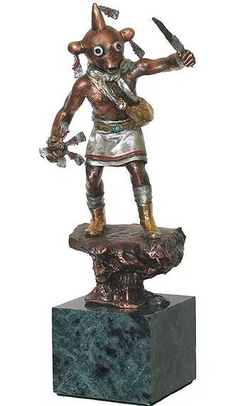 Koyemsi, Probably the most well-known of all Hopi Kachinas, Koyemsi (or Mud-head) usually appears in almost every Hopi ceremony as a myriad of colorful roles, such as a clown, interlocutor, announcer of dances, or drummer. He is usually the one that plays amusing games with the audience to the accompaniment of rollicking tunes. He then awards his game participants with food or clothing. Continually bringing such fun and frolic to his audience has made Koyemsi one of the most well-liked Hopi Kachinas..