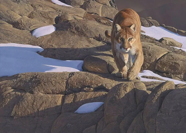 Fully Engaged captures the complete essence of this mountain lion in a single moment, a brief pause in an otherwise very physical existence. This 28 x 20 Fine Art Canvas Edition leaves us stilled at the fierce beauty of this alpine predator.