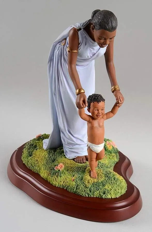 "I always knew I wanted to create Ebony Visions'. As an artist who happens to be black, I had distinct ideas about what I would like to see in the line." The elegant compeling figurines he created for the collection are a blen of both Art Nouveau and African culture, which Thomas calls "Afro-Nouveau." - Thomas Blackshear .Thomas Blackshear introduced Ebony Visions in April 1995 with the release of the first six Ebony Visions designs, The Storyteller, The Protector, The Nurturer, Siblings, Madonna and Tender Touch. Since then, Thomas Blackshear has created many new designs to add to the Ebony Visions collection. Thomas Blackshear's Ebony Visions collection is a master work of romantic symbolism. As with his paintings, these sculptures demonstrate Thomas Blackshear's incredible sense of design, unique eclectic style, and extraordinary mastery of color. Elegant drapery and delicate detail tantalize the eye while revealing each sculpted form. Thomas Blackshear's Ebony Visions depicts a full range of emotions that are both powerful and at the same time subtle. He deliberately portrays his Ebony Visions figures in a timeless setting in order to transcend a specific time, place, or culture. This unique collection of limited edition figurines emphasizes the beauty of the human form and symbolizes universal aspirations and ideals of humankind depicted through images that reflect the unique characteristics of the African American culture. For centuries classical beauty has been portrayed predominantly by white artisans who represent white subjects in their art. In this romantic and subtle tour de force, Thomas Blackshear creates a new vision of beauty and human emotion, an Ebony Vision.