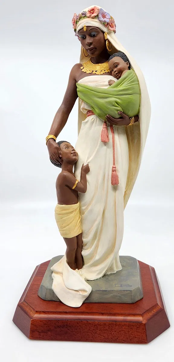 "I always knew I wanted to create Ebony Visions'. As an artist who happens to be black, I had distinct ideas about what I would like to see in the line." The elegant compeling figurines he created for the collection are a blen of both Art Nouveau and African culture, which Thomas calls "Afro-Nouveau." - Thomas Blackshear .Thomas Blackshear introduced Ebony Visions in April 1995 with the release of the first six Ebony Visions designs, The Storyteller, The Protector, The Nurturer, Siblings, Madonna and Tender Touch. Since then, Thomas Blackshear has created many new designs to add to the Ebony Visions collection. Thomas Blackshear's Ebony Visions collection is a master work of romantic symbolism. As with his paintings, these sculptures demonstrate Thomas Blackshear's incredible sense of design, unique eclectic style, and extraordinary mastery of color. Elegant drapery and delicate detail tantalize the eye while revealing each sculpted form. Thomas Blackshear's Ebony Visions depicts a full range of emotions that are both powerful and at the same time subtle. He deliberately portrays his Ebony Visions figures in a timeless setting in order to transcend a specific time, place, or culture. This unique collection of limited edition figurines emphasizes the beauty of the human form and symbolizes universal aspirations and ideals of humankind depicted through images that reflect the unique characteristics of the African American culture. For centuries classical beauty has been portrayed predominantly by white artisans who represent white subjects in their art. In this romantic and subtle tour de force, Thomas Blackshear creates a new vision of beauty and human emotion, an Ebony Vision.