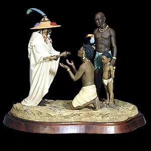 "I always knew I wanted to create Ebony Visions'. As an artist who happens to be black, I had distinct ideas about what I would like to see in the line." The elegant compeling figurines he created for the collection are a blen of both Art Nouveau and African culture, which Thomas calls "Afro-Nouveau." - Thomas Blackshear .Thomas Blackshear introduced Ebony Visions in April 1995 with the release of the first six Ebony Visions designs, The Storyteller, The Protector, The Nurturer, Siblings, Madonna and Tender Touch. Since then, Thomas Blackshear has created many new designs to add to the Ebony Visions collection. Thomas Blackshear's Ebony Visions collection is a master work of romantic symbolism. As with his paintings, these sculptures demonstrate Thomas Blackshear's incredible sense of design, unique eclectic style, and extraordinary mastery of color. Elegant drapery and delicate detail tantalize the eye while revealing each sculpted form. Thomas Blackshear's Ebony Visions depicts a full range of emotions that are both powerful and at the same time subtle. He deliberately portrays his Ebony Visions figures in a timeless setting in order to transcend a specific time, place, or culture. This unique collection of limited edition figurines emphasizes the beauty of the human form and symbolizes universal aspirations and ideals of humankind depicted through images that reflect the unique characteristics of the African American culture. For centuries classical beauty has been portrayed predominantly by white artisans who represent white subjects in their art. In this romantic and subtle tour de force, Thomas Blackshear creates a new vision of beauty and human emotion, an Ebony Vision.