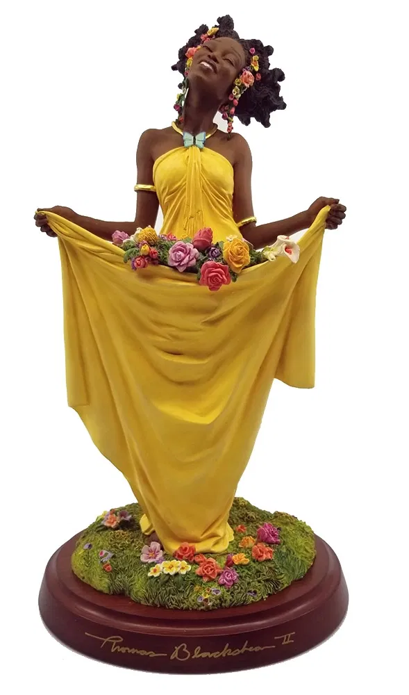 "I always knew I wanted to create Ebony Visions'. As an artist who happens to be black, I had distinct ideas about what I would like to see in the line." The elegant compeling figurines he created for the collection are a blen of both Art Nouveau and African culture, which Thomas calls "Afro-Nouveau." - Thomas Blackshear .Thomas Blackshear introduced Ebony Visions in April 1995 with the release of the first six Ebony Visions designs, The Storyteller, The Protector, The Nurturer, Siblings, Madonna and Tender Touch. Since then, Thomas Blackshear has created many new designs to add to the Ebony Visions collection. Thomas Blackshear's Ebony Visions collection is a master work of romantic symbolism. As with his paintings, these sculptures demonstrate Thomas Blackshear's incredible sense of design, unique eclectic style, and extraordinary mastery of color. Elegant drapery and delicate detail tantalize the eye while revealing each sculpted form. Thomas Blackshear's Ebony Visions depicts a full range of emotions that are both powerful and at the same time subtle. He deliberately portrays his Ebony Visions figures in a timeless setting in order to transcend a specific time, place, or culture. This unique collection of limited edition figurines emphasizes the beauty of the human form and symbolizes universal aspirations and ideals of humankind depicted through images that reflect the unique characteristics of the African American culture. For centuries classical beauty has been portrayed predominantly by white artisans who represent white subjects in their art. In this romantic and subtle tour de force, Thomas Blackshear creates a new vision of beauty and human emotion, an Ebony Vision.