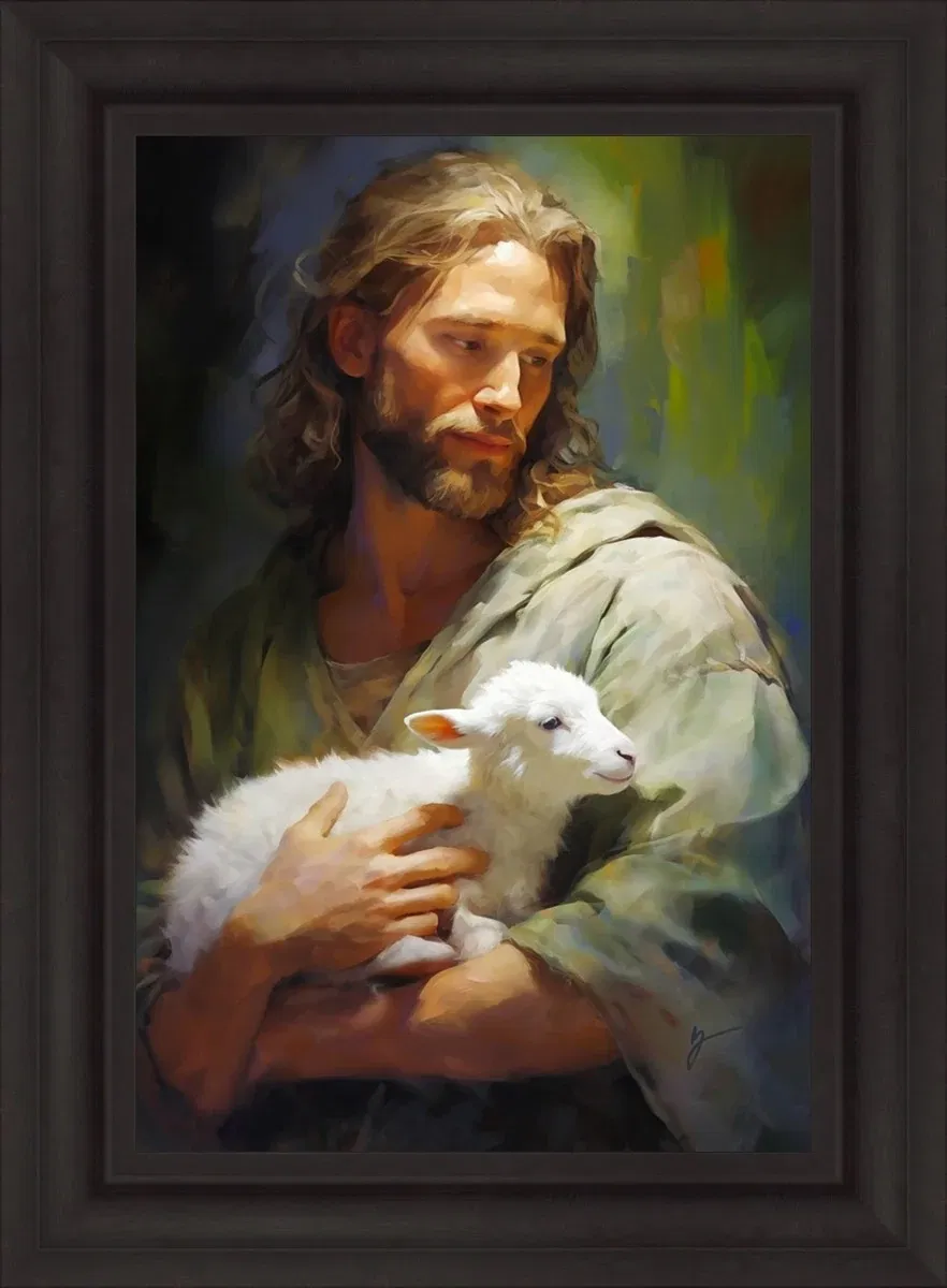 Gentle Savior Framed Brown — Giclee On Canvas Framed 31 3/4 X 43 3/4 - HVGENTLEBRL NOTES: Gentle Savior Framed Brown — Giclee On Canvas -DescriptionIn the pastoral realms of spiritual vulnerability, Jesus, the eternal Shepherd, cradles a small lamb in His tender embrace. This moment encapsulates His ceaseless care, symbolizing the intricate relationship between the Savior and His wandering sheep. As we stray into the precarious unknown, Jesus, with an ever-watchful gaze, calls us back, seeking to protect us from the perils that threaten our spiritual journey. His arms, a haven of love and guidance, encircle us, reflecting the deep well of compassion that fuels His mission. This scene resonates with the timeless narrative of redemption, inviting the viewer into the folds of divine care. A contemplative Jesus, radiating divine light, cradles a lamb in hues of green, white, and orange, creating a tapestry of earthy tones. The lighting, masterfully employed, illuminates the lamb and Jesus' face, casting a warm glow over the protective tableau. The lamb, nestled securely, embodies tranquility in the Savior's arms. The nuanced brushstrokes capture the essence of love and guardianship, inviting viewers into a sacred moment frozen in artistry. "Gentle Savior" is not merely a painting; it's an evocation of mercy, compassion, and love. Perfect for any Christian space, it extends an invitation to experience daily life steeped in the profound spirituality of Christ's protective embrace. This artwork transcends the canvas, becoming a vessel of serenity and grace. Owning this piece is an affirmation of a deep, personal connection with the Divine, enriching every moment with the enduring love of the Gentle Savior.. Gentle Savior Framed Brown  Giclee On Canvas by Greg Collins  Image Copyright © 2026 by Greg Collins