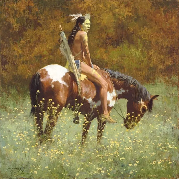 Quite simply, Howard Terpning is one of the most lauded painters of Western art. His awards are so numerous and he is honored with them so often, that to list them would require changing the count every few months. To name three would be to cite the highest prizes awarded to Western art: countless awards from the Cowboy Artists of America, the Hubbard Art Award for Excellence, the National Academy of Western Art s Prix de West and the Lifetime Achievement Award from the Gene Autry Museum. Why such praise? Passion, compassion, devotion and respect for his subject matter, extraordinary talent in palette and brushstroke, an exceptional ability to evoke emotion both in his paintings and from those viewing them — all this and more has made Terpning the "Storyteller of the Native American." Born in Illinois and educated at the Chicago Academy of Fine Arts and the American Academy of Art, he first gained attention from some powerful Time and Newsweek covers. Film fans praised his movie posters for such classics as The Sound of Music, Dr. Zhivago and the re-issue of Gone with the Wind. But his love of the West and Native American traditions saw his transition to fine art. Terpning was a long-time member of the Cowboy Artists of America, which has presented him with Gold and Silver awards, "Best of Show" awards, and "Best Overall Show by a Single Artist" awards more than two dozen times. His first book, The Art of Howard Terpning won the Wrangler "Outstanding Art Book" award from the National Cowboy Hall of Fame. Spirit of the Plains People, his second book, was released in 2001 in conjunction with a one-man show at the Eiteljorg Museum of American Indians and Western Art. A third, Tribute to the Plains People, was released in 2012 to celebrate his retrospective at The Autry National Center in Los Angeles.