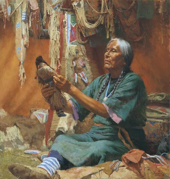 Quite simply, Howard Terpning is one of the most lauded painters of Western art. His awards are so numerous and he is honored with them so often, that to list them would require changing the count every few months. To name three would be to cite the highest prizes awarded to Western art: countless awards from the Cowboy Artists of America, the Hubbard Art Award for Excellence, the National Academy of Western Art s Prix de West and the Lifetime Achievement Award from the Gene Autry Museum. Why such praise? Passion, compassion, devotion and respect for his subject matter, extraordinary talent in palette and brushstroke, an exceptional ability to evoke emotion both in his paintings and from those viewing them — all this and more has made Terpning the "Storyteller of the Native American." Born in Illinois and educated at the Chicago Academy of Fine Arts and the American Academy of Art, he first gained attention from some powerful Time and Newsweek covers. Film fans praised his movie posters for such classics as The Sound of Music, Dr. Zhivago and the re-issue of Gone with the Wind. But his love of the West and Native American traditions saw his transition to fine art. Terpning was a long-time member of the Cowboy Artists of America, which has presented him with Gold and Silver awards, "Best of Show" awards, and "Best Overall Show by a Single Artist" awards more than two dozen times. His first book, The Art of Howard Terpning won the Wrangler "Outstanding Art Book" award from the National Cowboy Hall of Fame. Spirit of the Plains People, his second book, was released in 2001 in conjunction with a one-man show at the Eiteljorg Museum of American Indians and Western Art. A third, Tribute to the Plains People, was released in 2012 to celebrate his retrospective at The Autry National Center in Los Angeles.