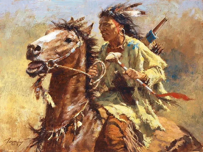 Quite simply, Howard Terpning is one of the most lauded painters of Western art. His awards are so numerous and he is honored with them so often, that to list them would require changing the count every few months. To name three would be to cite the highest prizes awarded to Western art: countless awards from the Cowboy Artists of America, the Hubbard Art Award for Excellence, the National Academy of Western Art s Prix de West and the Lifetime Achievement Award from the Gene Autry Museum. Why such praise? Passion, compassion, devotion and respect for his subject matter, extraordinary talent in palette and brushstroke, an exceptional ability to evoke emotion both in his paintings and from those viewing them — all this and more has made Terpning the "Storyteller of the Native American." Born in Illinois and educated at the Chicago Academy of Fine Arts and the American Academy of Art, he first gained attention from some powerful Time and Newsweek covers. Film fans praised his movie posters for such classics as The Sound of Music, Dr. Zhivago and the re-issue of Gone with the Wind. But his love of the West and Native American traditions saw his transition to fine art. Terpning was a long-time member of the Cowboy Artists of America, which has presented him with Gold and Silver awards, "Best of Show" awards, and "Best Overall Show by a Single Artist" awards more than two dozen times. His first book, The Art of Howard Terpning won the Wrangler "Outstanding Art Book" award from the National Cowboy Hall of Fame. Spirit of the Plains People, his second book, was released in 2001 in conjunction with a one-man show at the Eiteljorg Museum of American Indians and Western Art. A third, Tribute to the Plains People, was released in 2012 to celebrate his retrospective at The Autry National Center in Los Angeles.