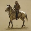 NOTES: BUFFALO BILL — Lithograph - Although he was a Pony Express rider, Civil War scout and state actor, Willam "Buffalo Bill" Cody is best remembered as the colorful showman who entertained the world with his "Wild West Show." Annie Oakley, Chief Sitting Bull and other performers helped Cody enthrall audiences everywhere with sharpshooting, horse tricks and other forms of Western amusement. This painting portrays the great showman in his later years, sitting tall in the saddle and ready for action. The model I used is a 74-year old gentleman who played the role of Buffalo Bill in an exciting re-creation of Cody's Wild West Show held in Cody, Wyoming..