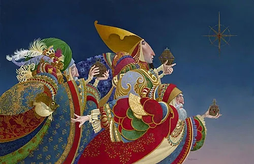 The sudden appearance of a new and brilliant star set the kings of the East on one of the Bible’s better-known journeys. Through the centuries, paintings have shown as many as eight kings. Some debate whether the magi were actual kings or a group of scholars, astronomers and priests. The Western tradition of three kings most likely arose from the three gifts of gold, frankincense and myrrh that they brought to “the newborn King.” James C. Christensen provides us with a gift to treasure the whole year through. In his original painting, the star and the three gifts of the kings are gold leaf. For both the print and canvas editions, we were able to recreate this radiant effect, in fact, the canvas is hand-crafted with 22-karat gold leaf.