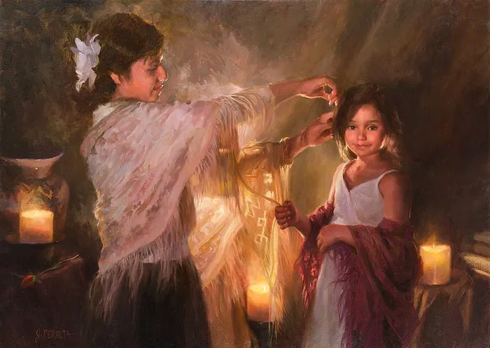JoAnn Peralta's inspiration for her artwork springs from her admiration and deep bond she had with her grandmother, Anita Peralta. She paints under her surname to pay homage to her. Both sides of Peralta's parents' lineage come directly from Spain as well as from Italy. The families eventually migrated to Mexico and then to the U.S. Anita arrived in California along with her husband, Ramon, in the early 20's. They established a meager living from itinerant farm work, picking seasonal crops and traveling via bus to those sites.