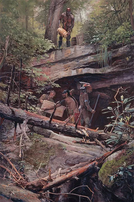 This work is a seminar unto itself in how a great artist uses design to tell a story. Plunder was as vital a means of support on the frontier as trade. After distribution of any “”windfall” among the tribe, the surplus would be hidden in a secure location. Buxton’s choice of a zig-zag composition draws your eye continuously up and down the painting. The only verticals in the painting are the Indians themselves, causing you to stop and inspect what each one is doing. The lack of a strong source of light adds to the secretive nature of the moment. Your eyes never leave the painting.
