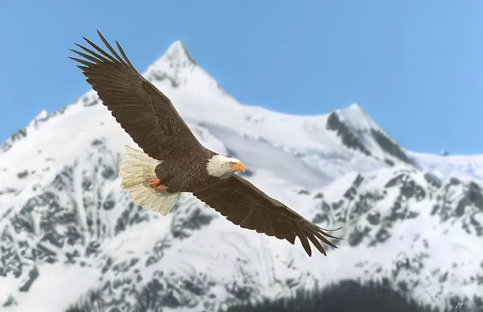 With John Bye’s The Patriot you are able to crest mountains side by side with this magnificent creature. Painted in his hyper-realistic HD Art style, one wonders whether Bye was aware that a mature bald eagle has nearly 7000 feathers when he began the project.