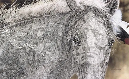 Judy Larson always knew she was going to be an artist. She was surrounded by them as a child, and was particularly inspired by her father, a professional illustrator. Judy received a Bachelor of Science degree in Commercial Art from Pacific Union College in Northern California, then spent the next 17 years as a commercial artist, illustrator and art director. In 1988, influenced by her love of nature and animals, Judy devoted her time to wildlife art. Her primary focus in each of her paintings is the animal, with the horse as a recurring subject. Her unique approach to her work is through the use of scratch board--a technique that can render magnificent detail but one requiring infinite patience. Scratch board, an old, but little used medium, consists of a smooth, thin surface of hardened China clay applied to a board. The subject is then painted solidly with black India ink to create a silhouette. Now the exacting work begins, engraving the image into the surface of the artwork. While many artists use steel nibs or engraving tools, Judy prefers to work with X-acto blades, changing them ever few minutes to produce as fine a line as possible. Once the subject has been totally scratched, it is a finished black and white illustration, ready for the artist to add color. The methods of adding color are diverse. Judy prefers a combination of airbrush, gouache or acrylics for finishing, with frequent rescratching for detail. Scratch board is a demanding medium, one that Judy has used masterfully in developing her unique approach to wildlife art.