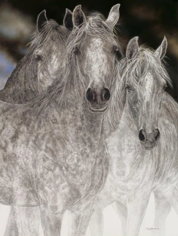 Judy Larson always knew she was going to be an artist. She was surrounded by them as a child, and was particularly inspired by her father, a professional illustrator. Judy received a Bachelor of Science degree in Commercial Art from Pacific Union College in Northern California, then spent the next 17 years as a commercial artist, illustrator and art director. In 1988, influenced by her love of nature and animals, Judy devoted her time to wildlife art. Her primary focus in each of her paintings is the animal, with the horse as a recurring subject. Her unique approach to her work is through the use of scratch board--a technique that can render magnificent detail but one requiring infinite patience. Scratch board, an old, but little used medium, consists of a smooth, thin surface of hardened China clay applied to a board. The subject is then painted solidly with black India ink to create a silhouette. Now the exacting work begins, engraving the image into the surface of the artwork. While many artists use steel nibs or engraving tools, Judy prefers to work with X-acto blades, changing them ever few minutes to produce as fine a line as possible. Once the subject has been totally scratched, it is a finished black and white illustration, ready for the artist to add color. The methods of adding color are diverse. Judy prefers a combination of airbrush, gouache or acrylics for finishing, with frequent rescratching for detail. Scratch board is a demanding medium, one that Judy has used masterfully in developing her unique approach to wildlife art.