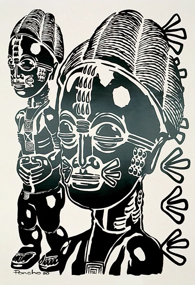 Larry "Poncho" Brown, a world leader in contemporary African American art, is a native of Baltimore, MD. He started his first business at the age of 17 as a signwriter and he has been a full time artist ever since. Poncho received his Bachelors of Fine Arts degree from the Maryland Institute College of Art, Baltimore, MD. His art, both fine and commercial, has been published nationally in Upscale, Ebony, Ebony Man, Essence, and Jet magazines. In February '99 his art was featured in the UCLA Fowler Museum of Cultural History Textile Series No. 2 book entitled "Wrapped In Pride". His most popular artwork titled "Black is Black" and works from "Egyptian Queens" series has been featured on the former hit TV show "A Different World." "Sidesteppin" was featured on the HBO mini series "Laurel Avenue", and "One Love" has been featured on "In The House". His work adorns the walls of the likes of Bill Cosby, Dick Gregory, Anita Baker, Susan Taylor, and Bernard Bronner just to name a few. In pursuing his philanthropic goals, he founded "The African American Youth Art Exhibition" which recently celebrated its 10th Anniversary. He also co-founded Artistic Legacy, a not for profit organization that sponsors art workshops for youth. Admirers often site rhythm, movement, and unity, as favorite elements in his work. He primarily works in acrylic, although he uses a variety of mediums and styles to express his interests in Afrocentric themes, Ancient Egyptology and dance. Poncho's unique style combines past and present art stylizations to create a sense of realism, mysticism, and beauty, which gives his art universal appeal. His contemporary paintings are a reflection of his personal values and pay homage to ongoing themes of family, community and spirituality.