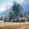 NOTES: Works by Martin Grelle are some of the most highly sought in the art world. This outstanding image is in the tradition of the talented artist's works. A brave returns to his camp with a herd of horses after having taken them to the river for water. His camp, nestled in a grove of trees in the beautiful valley, offers welcome shelter after his journey "Back from the River.".