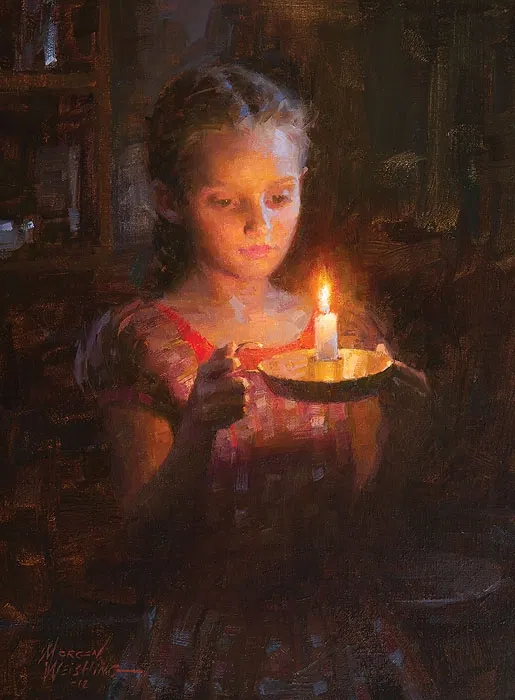 "Morgan Weistling began his artistic training on his father's lap at 19 months of age, where he learned how to draw and more importantly, use his imagination. Capitalizing on his father s talent for telling a story in comic strip form, Morgan began to develop a sense of narrative in his drawing. "It was here that art became a language for me." At the age of 12, Morgan applied his interest in art to studying his father s art books and began his art school studies at the Brandes Art Institute at 15. Working in a Los Angeles art supply store while attending art school, Morgan chanced to show his artwork to a prominent illustrator. As a result of their encounter, at the age of 19, Weistling found himself employed at a top movie poster agency in Hollywood. For the next 14 years, Morgan illustrated for every movie studio in Hollywood. His clients included Universal/Amblin Entertainment, Disney, MGM, Paramount, 20th Century Fox, Warner Brothers, Columbia Pictures and TriStar. In addition to movie posters, Weistling created all the cover artwork for the video series, McGee and Me for Focus on the Family and his art can be seen on numerous magazine, book, CD and video covers as well as Sega pinball machines. Since he has made fine art the focus of his art career, the collector demand for his originals has been overwhelming. With his masterful use of oils, Morgan Weistling brings a scene to life with spectacular lighting, creating a sense of wonder and engaging the viewer s imagination and emotion. His dreamlike images touch the viewer s heart, using more than sentimentality to engage the viewer. His canvases are filled with brushwork that tells a story beyond the subject matter. Like a skilled movie director, he manipulates the focus of interest with suggestions and impressions of forms that are barely realized and allow the viewer s imagination to fill in the details. "There is a story underneath the story of my paintings," Morgan adds, "I don t hide the process of how I painted it. You can see the layers and count the strokes it took to get there. With some styles of painting, the closer you get to the canvas, the more you will see. With mine, the more you step back, the more detail you will see. That s not easy, which is why it fascinates me." Morgan Weistling follows in the footsteps of the masters he admires, John Singer Sargent, Anders Zorn and Nicolai Fechin as well as many others. In all of his vibrant work, from western art to feminine forms, Weistling crafts a narrative, driven by clarity, focus and purpose, drawing on images inspired by his beliefs and scenes from daily life. "My hope is that people will enjoy viewing my artwork as much I enjoyed painting it. For me, art is my language used to communicate to others how I see God s creation. When I experience another artist s work, I love to see through their eyes and find out as much about the artist as the subject they painted. That is what makes art so interesting." Weistling, a highly sought-after teacher, conducts private workshops with juried students and teaches at the prestigious Scottsdale Artist School. Recent honors and awards include the Patron s Choice Award and the Trustees Purchase Award at the Autry Museum of Western Heritage in Los Angeles, CA, the Prix de West Purchase Award at the National Cowboy and Western Heritage Museum in Oklahoma City, OK, and the Patron's Choice Award at the Autry Museum of Western Heritage. Weistling's book, The Image of Christ, was a finalist for the Evangelical Christian Publishers Association Gold Medallion Book Award. Weistling and his artist wife JoAnn, whom he met in art school, have been married for 14 years. Their 9 year-old daughter is often a model in Weistling s paintings. They make their home in California. "