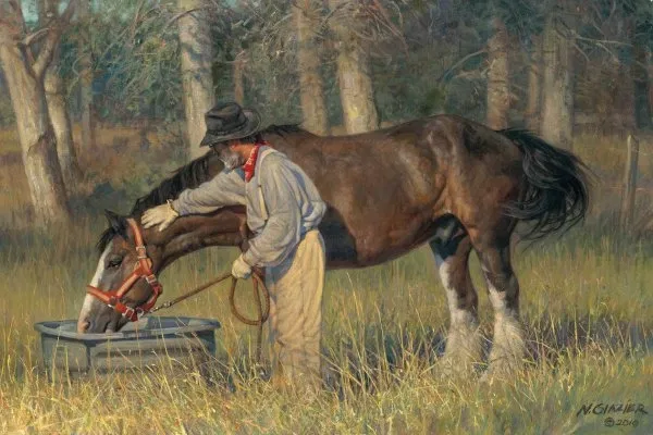 Always knowing she wanted to be an artist, Nancy Glazier's grandmother presented her with her first set of oil paints when she was eight. Her delighted father sold her first painting when she was twelve. Her family moved to Wyoming when she was sixteen. Glazier was introduced to Cody Museum muralist, Adolph Spohr, who singled her out for private instruction. Painting is the very breath of her life. While she is painting, Glazier feels complete, joyful, powerful and free. Today, the animals Glazier prefers to paint are truly wild and free. Elk, deer, moose, bear, cougar, coyote, fox, birds from osprey to pine siskin, share their territory with her in the mountains of the Northwest. "My paintings invite you into this world. Journey with me awhile. I will share with you what the eyes of my heart see."