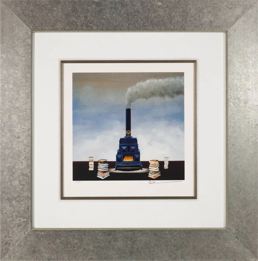 Robert Deyber Cooking The Books Framed hand-crafted stone lithograph