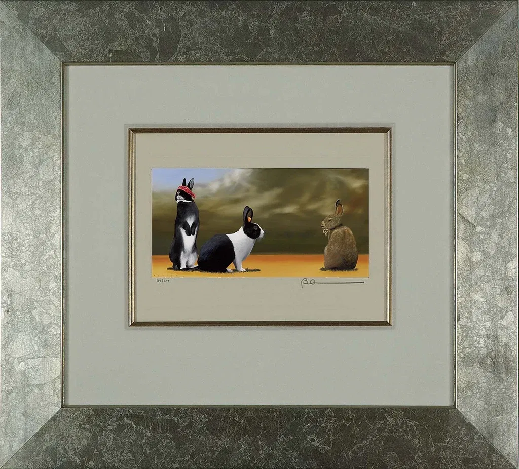 Robert Deyber See No Evil, Hear No Evil, Speak No Evil - Hares Framed hand-crafted stone lithograph