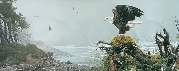 “It’s one of my favorite subjects to paint,” says Rod Frederick. “I see them all the time here in the Cascades.” Over two thirds of the world’s bald eagle population has “come home” to breed and thrive in Alaska and British Columbia, largely due to the undeveloped land and the salmon fisheries.