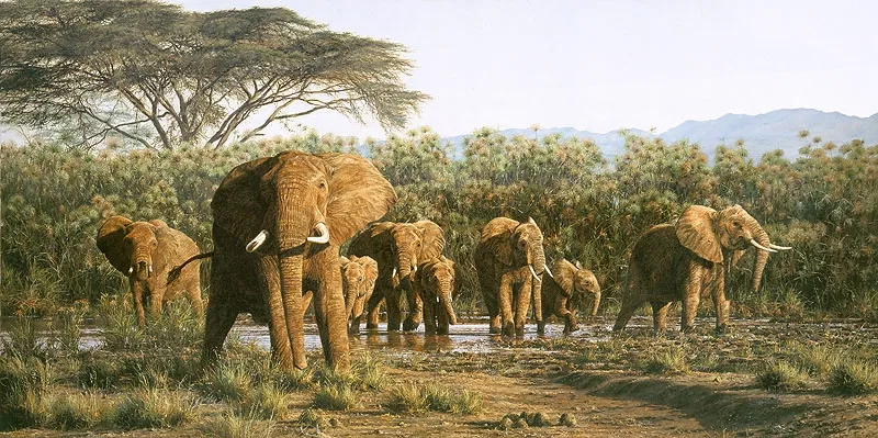 "In 1940, Simon Combes was born in "Wilderness Cottage€¬," in Shaftsbury, England, and from that day in June, the wilderness always attracted him. His first adventures began early when, in 1946, his parents immigrated to farm in Kenya s Great Rift Valley, a magical place for a young boy. Simon loathed his years at boarding school in Nakuru and at Duke of York in Nairobi, always longing for the freedom of the bush. While managing a 2,000 acre farm when he was seventeen, he was drafted into six months compulsory military training after already applying for appointment in the Kings African Rifles. He was accepted into 4 KAR but having just finished his training was sent to Uganda where one of his duties was to teach basic etiquette and rugby to a young Idi Amin. He attended Sandhurst Military Academy and returned to Kenya to join the 3rd Kings African Rifles in time for Kenya s Independence. In 1964, Simon was chosen to form and command Kenya s elite Parachute Regiment. This involved training the first 250 paratroopers in England, and translating all the instruction books into Swahili. Their first posting back in Kenya was fighting the Shifta war in the North Eastern province. It was during this time Simon started to draw and paint as a hobby to occupy his spare time. His subjects were the Somali and Boran people and the landscapes of the North. In 1969, he held his first exhibition in Nairobi which was a sell-out on the opening night. It was then that the idea of painting full-time started. However, he was refused release from the army and was moved to army HQ as staff officer in charge of all operations and training. He was also captain of the army shooting team and vice chairman to the Kenya Rifle Association. A Major at 28 and performing the duties of a Lieutenant Colonel, his military peers remember him fondly as a "True Kenyan." Finally, in 1974, he was released from the army and started life as a professional artist. Best known for his stunning images wildlife in the African bush, he achieved worldwide success and acclamation through many prestigious awards. His paintings hang in private and museum collections around the globe. Simon s life was rich with great adventures and wildlife encounters. From being lost in a blizzard while crossing the Altai Mountains in Mongolia and flying into the jungles of Venezuela to sketching Bengal Tigers atop a howdah on a swaying elephant in India, his experiences and observations led him to develop his exacting artistic style, rendering his subjects with such depth and exquisite detail. Africa & Beyond: The Art and Adventures of Simon Combes, a retrospective exhibition of Simon s major works, was held at The Wildlife Experience Museum in 2004 to celebrate his great artistic achievements. Since 1979, The Greenwich Workshop, Inc., has published his works as Fine Art Reproductions on paper and canvas. He always said, if given the time he would rather write than paint. This talent is apparent in his books An African Experience, distributed by The Greenwich Workshop and Great Cats, published by The Greenwich Workshop, Inc. Simon was also working on a book of Limericks about life in Kenya which reveals his ability to entertain us with his wit and humor. Simon had a wonderful talent for communication, whether in speech, writing or painting. Never self assuming, he gave talks in Kiswahili to the farm staff, through a translator to school children in Russia and also to many interested groups around the world. Not only a man of the arts, but an avid conservationist as well, Simon had recently appointed Kenya Representative and Project Director for Rhino Rescue Trust. He sat on the boards of several wildlife conservation organizations and raised, through his art, many thousands of dollars for their causes. On Sunday, December 12, 2004, atop a beautiful ancient volcano near his home in Africa s Great Rift Valley, Simon s life was tragically taken by one of the wild animals he so lovingly portrayed in his paintings. He never "gathered moss" and now he has come home. He is survived by his wife Kat, his children, Cindy and Guy, his sister, Jenny all of Kenya and his former wife Susie of England. We shall remember Simon well.