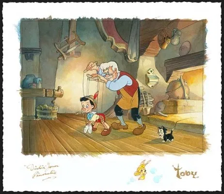 Walt Disney was a man who had an amazing ability to inspire other people to remarkable creative achievements. Toby Bluth happens to be one of those shining gems of talent that to this day draws inspiration from the life and work of Walt Disney. Starting with Snow White and the Seven Dwarfs then continuing with Pinocchio, Fantasia, Dumbo and Bambi, the first five feature length films to come out of Walt Disney Studios, according to Bluth, are the five gems in the crown of animation s royal history. Just as those five films marked Walt s grand entrance into feature length storytelling they, quite appropriately, set the stage for the first five limited edition giclées in Bluth s Disney Fine Art portfolio. Infused with all the depth, texture and richness of Toby s original watercolors these fine prints will be enjoyed for generations, very much in the spirit of the timeless classics that inspired them. Technique and approach "Creating the moment that you think you saw…" is how Toby Bluth describes his approach in conceiving each one of his watercolor masterpieces. Believing that how one remembers a film is often different from the actual film itself, Toby paints what he perceives as the collective memory of a film experience and taps into the emotional essence of the story. Inspired by the work of legendary illustrator Gustaf Tengrenn, whom Walt Disney recruited to work on Snow White and the Seven Dwarfs, Bluth is passionate about his craft. A multifaceted artist, Toby s creative endeavors do not end at the tip of his brush. He is an accomplished writer, director, designer and a veteran of the American musical stage, having performed and or directed in nearly one hundred musicals, both on Broadway and beyond. Most recently he served as Art Director for The Walt Disney Studios production of The Three Musketeers, having already served in that position for the animated feature film The Tigger Movie.