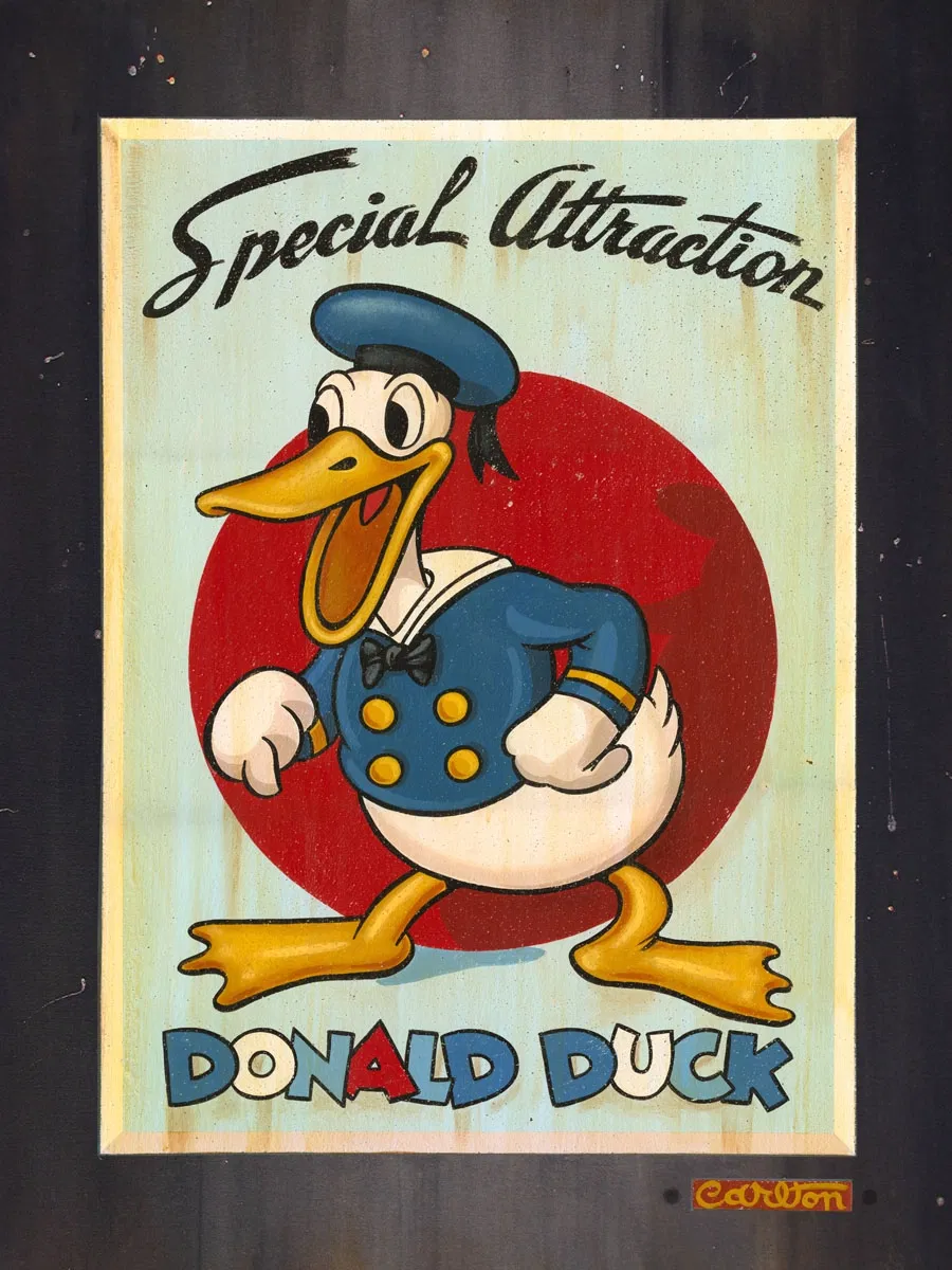 Monte Trevor Carlton was born in 1972 in Olympia, Washington State. Although he took up painting in high school, the first artistic passion that Trevor embraced was acting. He decided to forgo an art scholarship in favor of attending a dramatic arts scholarship at Skagit Valley College. Trevor next attended the Lee Strasberg Acting Workshop. The following year he relocated to Los Angeles to pursue an acting career. Amidst the chaos of auditions and callbacks, Trevor paid the bills by working in a custom furniture store, specializing in antiquing and faux finish designs. It was here that a style was born. Using reclaimed lumber as his "canvas", he started painting images of vintage Americana with subjects ranging from pop icon celebrity to the hey day of jazz. After numerous gallery shows in Los Angeles and private commissions he has now combined his unique style to that most American of symbols, MICKEY MOUSE. Along with a series of classic lobby card paintings, he has also created a performance piece that has him painting a large canvas of our favorite Disney characters in a matter of minutes.