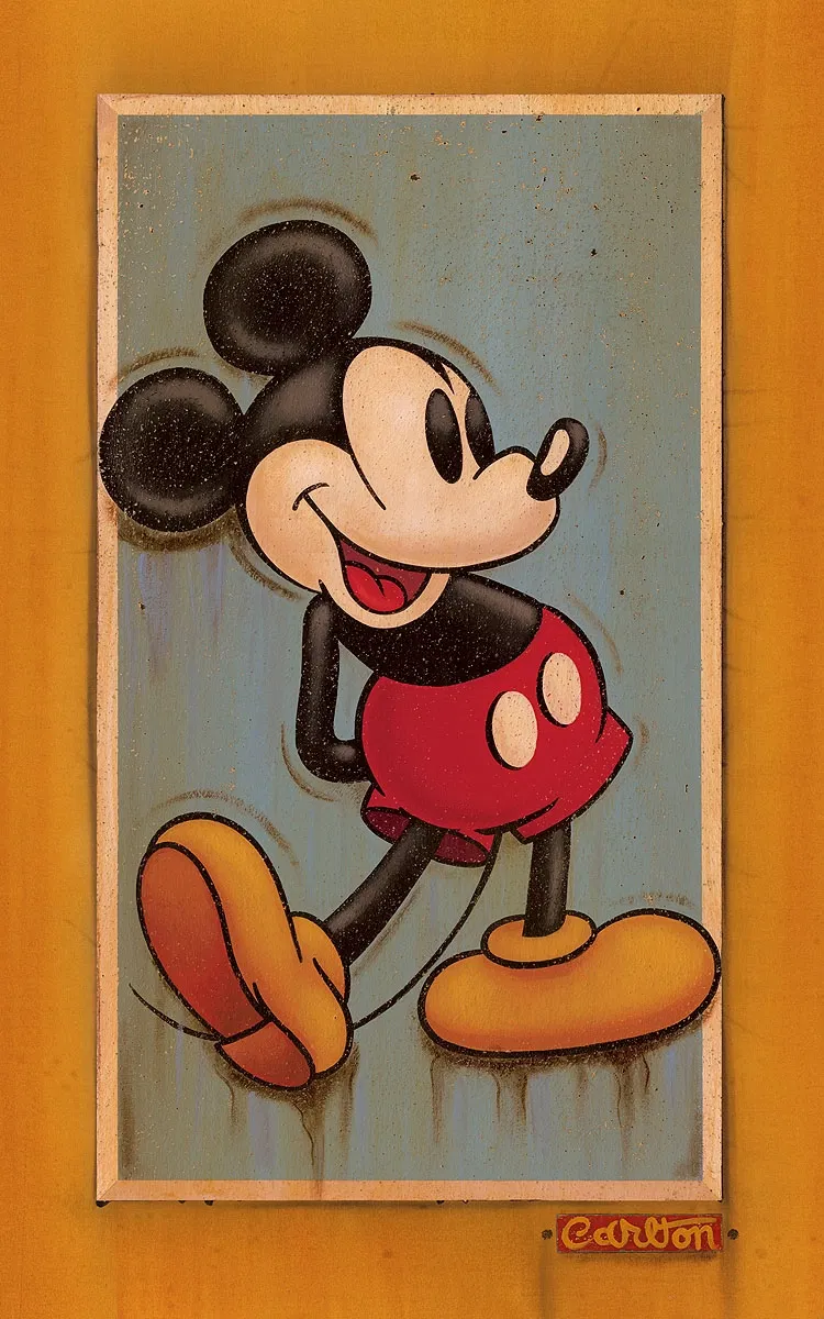Monte Trevor Carlton was born in 1972 in Olympia, Washington State. Although he took up painting in high school, the first artistic passion that Trevor embraced was acting. He decided to forgo an art scholarship in favor of attending a dramatic arts scholarship at Skagit Valley College. Trevor next attended the Lee Strasberg Acting Workshop. The following year he relocated to Los Angeles to pursue an acting career. Amidst the chaos of auditions and callbacks, Trevor paid the bills by working in a custom furniture store, specializing in antiquing and faux finish designs. It was here that a style was born. Using reclaimed lumber as his "canvas", he started painting images of vintage Americana with subjects ranging from pop icon celebrity to the hey day of jazz. After numerous gallery shows in Los Angeles and private commissions he has now combined his unique style to that most American of symbols, MICKEY MOUSE. Along with a series of classic lobby card paintings, he has also created a performance piece that has him painting a large canvas of our favorite Disney characters in a matter of minutes.