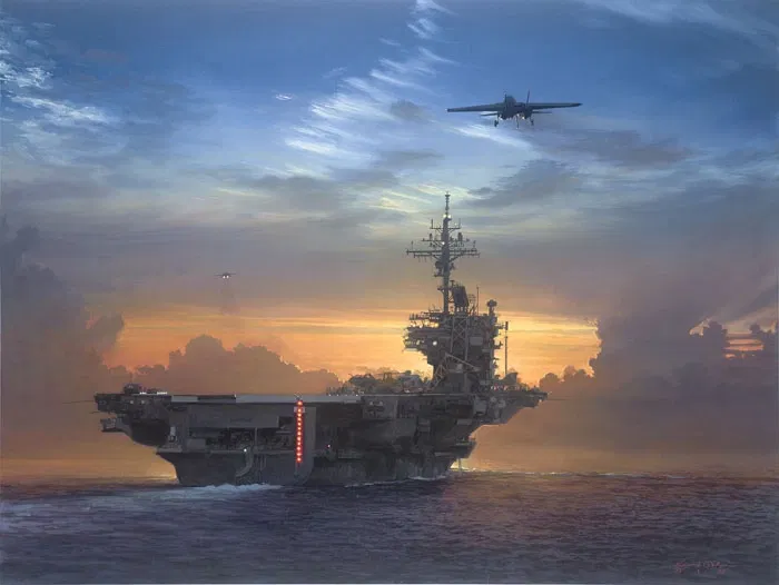 “In the late 1970s, I had the chance to deploy on the USS Kitty Hawk (CV 63) out of San Diego, but this scene could be anywhere in the world because sunsets are universal at sea. Coming on board a carrier is tough no matter what time of day it is. But I’ll tell you, landing in any kind of daylight beats coming aboard before absolute dark. They call flight operations at this time “Pink Ops.” The CAP aircraft, both coming in and going out, are early versions of the F-14.”
