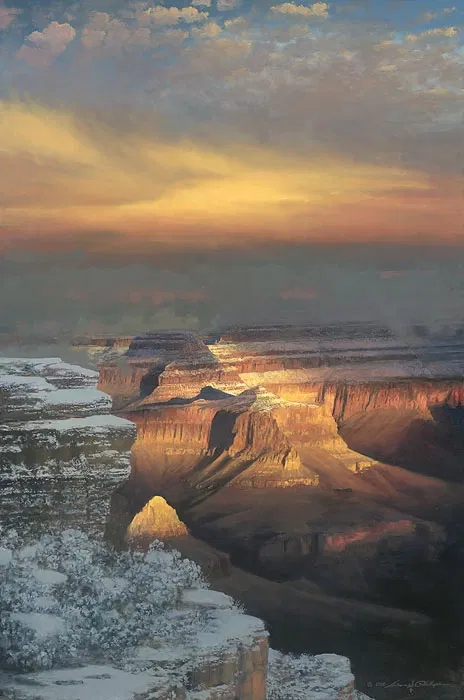 William S. Phillips’ Winter Splendor captures the inspiring and humbling nature of the Grand Canyon as a new day begins. This majestic American landscape is available as either a large or moderately sized Fine Art Canvas and both are simply gorgeous. As the artist’s wife, Kristi, explained to us, “I’ve always regretted that we sold this painting. I really wanted us to keep it. Now, I finally have one to hang!”