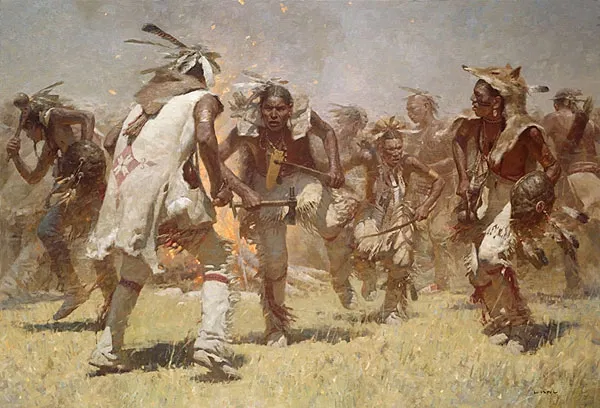 “The war dance of the Northeast Indian tribes was held before the raid,” relates Liang. “Large fires were lit in the center of the village. The fiercely painted warriors gathered around the fire. The chief would give a speech to convince his people that the forthcoming strike was with the approval and guidance of the Great Spirit. The drum started in a slow pulse rated beat. The excitement heated up as the beat got faster, accompanied by rattling and singing. The war leader took his club and stamped the ground as if to shake the universe then began to dance and sing. Warriors started to rise and join the war dance. As each joined in, they became a volunteer for the raid. The war party was formed strictly by volunteers. War dances were usually held at night.”
