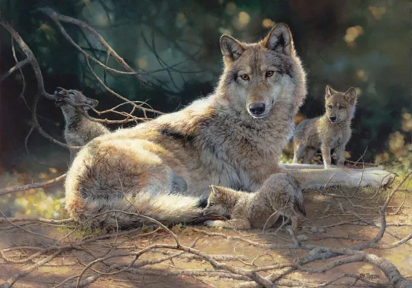 “Wolf pups love to play. They will chase and wrestle with each other just as puppy dogs do. As is often the case in the wild, many of their games appear to be practice for the things they will do as adult wolves. When they are not wrestling with each other, any object becomes fair game for ‘the hunt’. Sticks, feathers, bones or even their mother’s tail is prey to be stalked and captured in the safety of their deep wood rendezvous site.”