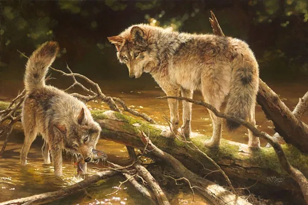 This year marks twenty-five years of Bonnie Marris Fine Art Editions from The Greenwich Workshop so it is serendipitous and fitting that her newest release is a subject close to her very first limited edition with us in 1985. In that edition, titled “The Fishing Lesson,” a mother wolf watches her two cubs at the rocky edge of water as they peer down at what could be dinner if only they figure out how to catch it.