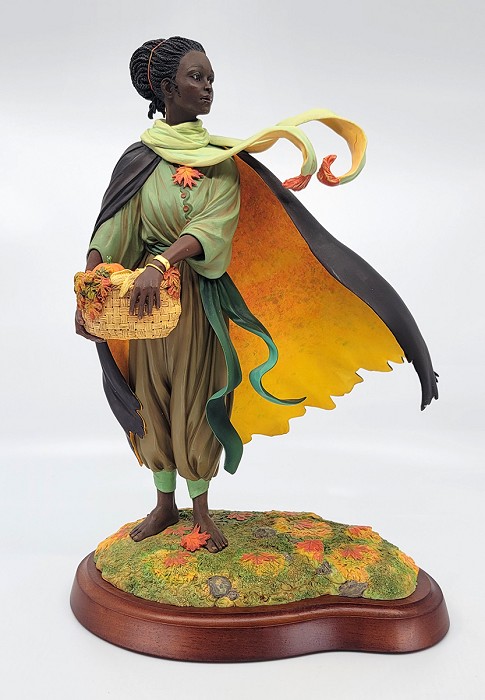 "I always knew I wanted to create Ebony Visions'. As an artist who happens to be black, I had distinct ideas about what I would like to see in the line." The elegant compeling figurines he created for the collection are a blen of both Art Nouveau and African culture, which Thomas calls "Afro-Nouveau." - Thomas Blackshear .Thomas Blackshear introduced Ebony Visions in April 1995 with the release of the first six Ebony Visions designs, The Storyteller, The Protector, The Nurturer, Siblings, Madonna and Tender Touch. Since then, Thomas Blackshear has created many new designs to add to the Ebony Visions collection. Thomas Blackshear's Ebony Visions collection is a master work of romantic symbolism. As with his paintings, these sculptures demonstrate Thomas Blackshear's incredible sense of design, unique eclectic style, and extraordinary mastery of color. Elegant drapery and delicate detail tantalize the eye while revealing each sculpted form. Thomas Blackshear's Ebony Visions depicts a full range of emotions that are both powerful and at the same time subtle. He deliberately portrays his Ebony Visions figures in a timeless setting in order to transcend a specific time, place, or culture. This unique collection of limited edition figurines emphasizes the beauty of the human form and symbolizes universal aspirations and ideals of humankind depicted through images that reflect the unique characteristics of the African American culture. For centuries classical beauty has been portrayed predominantly by white artisans who represent white subjects in their art. In this romantic and subtle tour de force, Thomas Blackshear creates a new vision of beauty and human emotion, an Ebony Vision.