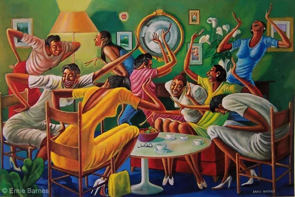 Ernie Barnes was born July 15, 1938. Endowed with an innate sensitivity, he knew early in life that he wanted to become an artist. Initial impressions were fashioned in the rich soil of Durham, North Carolina, while his sensibilities were cultivated in a loving home by his parents, Ernest Sr. and Fannie (Geer) Barnes. As a child, he often accompanied his mother to the home of the prominent attorney, Frank Fuller, Jr., where she worked as a domestic. Through his expansive library, Fuller introduced Barnes to the works of the great master artists such as Rembrandt, Raphael and Michelangelo. Amidst the harshness of life in the segregated south in the1940's, artistic ambitions would prove to be an impossibility. His father echoed the sentiments of many in ridiculing and forbidding young Ernest's desire to be an artist. His peers also asserted their disdain by beating him on a daily basis. The isolation and despair of this shy, fat, un-athletic boy plagued him until he reached junior high school. Through the constant encouragement of one of his teachers, he painstakingly reinvented himself, graduating from high school with 26 football scholarships and the respect of the entire community. Shielded by the virility of football, Barnes majored in art. He would have preferred to attend the local Duke University or University of North Carolina at Chapel Hill, but blacks were not yet allowed on those campuses. He received his academic training at North Carolina College (now North Carolina Central University) in Durham, and is an heir to the legacy of the Harlem Renaissance, which was handed down by his teachers W. B. Fletcher and Ed Wilson. Emphasizing skill and the fundamentals, their traditional courses gave Barnes the necessary foundation to develop his own style. His desire to become an artist, however, was deeply challenged on a 1956 field trip to the newly-desegregated North Carolina Museum of Art. When he was unable to find paintings of or by blacks anywhere in the museum, he asked where they were exhibited. In response, the Caucasian docent summed up the prevailing attitude of the time when she emphatically declared, "Your people don't express themselves this way." In that instance, Barnes realized the prejudices and hurdles he would have to overcome in his quest to be an artist, and the gravity of the task he had set out for himself. Having acquired the necessary tutelage, Barnes' principal ambition was to become the artist he was told he could never be. His figurative mode of expression, however, was completely contrary to the abstract paintings which had come into vogue. Without a role model or resource for encouragement in art, Barnes instead entered the arena of professional football. In 1960, he was the 10th draft choice of the then-World Champion Baltimore Colts. He spent five successful seasons as an offensive guard for the San Diego Chargers (1960-62), and later for the Denver Broncos (1963-64). Many of his early works reflected his time on the playing field. He credits the energy of the game for inspiring his mannerist style of painting and fluidity of technique. In 1965, Barnes retired from football to devote his life to art. His break into the art world came when former hotel chairman and Charger team owner Barron Hilton facilitated a meeting with the late New York Jets owner, David Werblin. Following a critical art evaluation in which Barnes was deemed "the most expressive painter of the American scene since George Bellows," Werblin paid Barnes his football salary to quit football and hone his skills as an artist. Recognizing the racial barriers inherent in America's infrastructure, Werblin sponsored Barnes' first solo exhibition, placing him with Manhattan's prestigious Grand Central Art Galleries. Following that sold-out show, Barnes moved to Los Angeles and began exhibiting his art consistently. Away from his easel, he pursued opportunities in the entertainment industry and created the CBS Super Comedy Bowl, which aired from 1969-1970. As an actor, he had featured roles in three films: Number One with Charlton Heston; Doctors' Wives, and Don't Look Back, the story of Satchel Paige. He also appeared on the ABC television series, Doctors' Hospital for one season. Barnes found great success in Hollywood, and the entertainment community simultaneously embraced him as an artist by avidly collecting his work. The social and political climate of the late 1960's and early 1970's ignited Barnes' imagination. As civil rights and the black pride movement exploded, he was providing positive and tangible examples. His vision was presented in 1971 through his solo exhibition, The Beauty of the Ghetto. Hosted by the late Mayor Tom Bradley, it premiered in Los Angeles at the Heritage Gallery, with several successive showings, including a 1974 presentation hosted by Ethel Kennedy in Washington, D.C. The exhibition filled a void, as it was the first visible testimony to illuminate the endearing and virtuous aspects of black life in America. The response was overwhelming. One of the paintings from the exhibition, titled Sugar Shack became the most visible painting by an American artist since Edward Hopper's Nighthawks. The image was used by producer Norman Lear for the opening credits of his television show Good Times, and by Marvin Gaye as the cover to his 1976 album. The unifying effects of the exhibition garnered Barnes many accolades, and in 1974 Representative John Conyers wrote Barnes into the Congressional Record. This memorable exhibition intentionally moved away from themes of social and political protest. By giving vision to the common properties in the daily lives of African Americans, Barnes defined the very essence of a culture. His work and unique style influenced countless artists to emulate him, forging the path for what has become known as "black art" in America. Due to the impact of the exhibition, many have tried to identify Barnes solely as an interpreter of African American