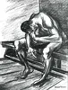 FROM THE ARTIST: He is a drawing which ally needs no explanation. It is a drawing portraying the moods and excitement in the game of football – a game which does strange things to men…makes them lose their heads…makes them hate. It is primeval combat…elbows and shoulder pads…muscle and helmets. It is a George Plimpton discoved, no place for Walter Mitty. I have tried, in my art to -embody all of the elements of the game in order to portray my subject as fact…deliberately distorting the body in order to inject the stngth and the spirit of the men who play the game. It is almost impossible to introduce the athlete in the art of satisfying his thirst for competitiveness in athletics…unless the mood and guts of the game a dramatically expssed. Even befo my pencil touches the pArtist Proofer, I mentally strip my idea of its concte accompaniments – in order to inject my composition with actual ality and spirit.