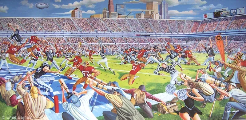 Ernie Barnes was born July 15, 1938. Endowed with an innate sensitivity, he knew early in life that he wanted to become an artist. Initial impressions were fashioned in the rich soil of Durham, North Carolina, while his sensibilities were cultivated in a loving home by his parents, Ernest Sr. and Fannie (Geer) Barnes. As a child, he often accompanied his mother to the home of the prominent attorney, Frank Fuller, Jr., where she worked as a domestic. Through his expansive library, Fuller introduced Barnes to the works of the great master artists such as Rembrandt, Raphael and Michelangelo. Amidst the harshness of life in the segregated south in the1940's, artistic ambitions would prove to be an impossibility. His father echoed the sentiments of many in ridiculing and forbidding young Ernest's desire to be an artist. His peers also asserted their disdain by beating him on a daily basis. The isolation and despair of this shy, fat, un-athletic boy plagued him until he reached junior high school. Through the constant encouragement of one of his teachers, he painstakingly reinvented himself, graduating from high school with 26 football scholarships and the respect of the entire community. Shielded by the virility of football, Barnes majored in art. He would have preferred to attend the local Duke University or University of North Carolina at Chapel Hill, but blacks were not yet allowed on those campuses. He received his academic training at North Carolina College (now North Carolina Central University) in Durham, and is an heir to the legacy of the Harlem Renaissance, which was handed down by his teachers W. B. Fletcher and Ed Wilson. Emphasizing skill and the fundamentals, their traditional courses gave Barnes the necessary foundation to develop his own style. His desire to become an artist, however, was deeply challenged on a 1956 field trip to the newly-desegregated North Carolina Museum of Art. When he was unable to find paintings of or by blacks anywhere in the museum, he asked where they were exhibited. In response, the Caucasian docent summed up the prevailing attitude of the time when she emphatically declared, "Your people don't express themselves this way." In that instance, Barnes realized the prejudices and hurdles he would have to overcome in his quest to be an artist, and the gravity of the task he had set out for himself. Having acquired the necessary tutelage, Barnes' principal ambition was to become the artist he was told he could never be. His figurative mode of expression, however, was completely contrary to the abstract paintings which had come into vogue. Without a role model or resource for encouragement in art, Barnes instead entered the arena of professional football. In 1960, he was the 10th draft choice of the then-World Champion Baltimore Colts. He spent five successful seasons as an offensive guard for the San Diego Chargers (1960-62), and later for the Denver Broncos (1963-64). Many of his early works reflected his time on the playing field. He credits the energy of the game for inspiring his mannerist style of painting and fluidity of technique. In 1965, Barnes retired from football to devote his life to art. His break into the art world came when former hotel chairman and Charger team owner Barron Hilton facilitated a meeting with the late New York Jets owner, David Werblin. Following a critical art evaluation in which Barnes was deemed "the most expressive painter of the American scene since George Bellows," Werblin paid Barnes his football salary to quit football and hone his skills as an artist. Recognizing the racial barriers inherent in America's infrastructure, Werblin sponsored Barnes' first solo exhibition, placing him with Manhattan's prestigious Grand Central Art Galleries. Following that sold-out show, Barnes moved to Los Angeles and began exhibiting his art consistently. Away from his easel, he pursued opportunities in the entertainment industry and created the CBS Super Comedy Bowl, which aired from 1969-1970. As an actor, he had featured roles in three films: Number One with Charlton Heston; Doctors' Wives, and Don't Look Back, the story of Satchel Paige. He also appeared on the ABC television series, Doctors' Hospital for one season. Barnes found great success in Hollywood, and the entertainment community simultaneously embraced him as an artist by avidly collecting his work. The social and political climate of the late 1960's and early 1970's ignited Barnes' imagination. As civil rights and the black pride movement exploded, he was providing positive and tangible examples. His vision was presented in 1971 through his solo exhibition, The Beauty of the Ghetto. Hosted by the late Mayor Tom Bradley, it premiered in Los Angeles at the Heritage Gallery, with several successive showings, including a 1974 presentation hosted by Ethel Kennedy in Washington, D.C. The exhibition filled a void, as it was the first visible testimony to illuminate the endearing and virtuous aspects of black life in America. The response was overwhelming. One of the paintings from the exhibition, titled Sugar Shack became the most visible painting by an American artist since Edward Hopper's Nighthawks. The image was used by producer Norman Lear for the opening credits of his television show Good Times, and by Marvin Gaye as the cover to his 1976 album. The unifying effects of the exhibition garnered Barnes many accolades, and in 1974 Representative John Conyers wrote Barnes into the Congressional Record. This memorable exhibition intentionally moved away from themes of social and political protest. By giving vision to the common properties in the daily lives of African Americans, Barnes defined the very essence of a culture. His work and unique style influenced countless artists to emulate him, forging the path for what has become known as "black art" in America. Due to the impact of the exhibition, many have tried to identify Barnes solely as an interpreter of African American