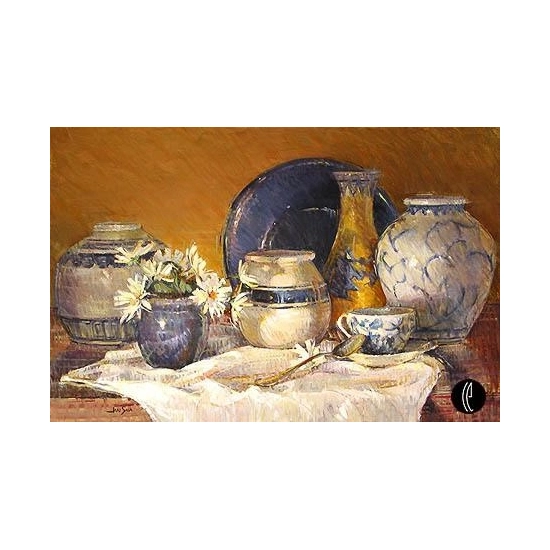 Jan Saia's masterful modern still life paintings are abundant with talent and unforgettable style. Her innovative technique is part traditional painting, part sketching with a paintbrush dipped in color. "When I lay a color down," she explains, "I usually lay it down knowing that I am going to put something on top of it that you can see through." As her paint is applied to the canvas, timing becomes an essential component in the process. At a precise point in time, she lets the piece set before returning to it in order to work with the paint's altered viscosity. This creates new dimensions in both color and texture. "It's a timing thing that you learn by doing," she relates. With her unique still life paintings that are carefully tooled with personal style and technique, Jan has taken one of the most traditional art genres and reinvented to create her singular style. But long before the brush hits the canvas, another lengthy and entirely different process takes place. Jan creates the "scene" she will paint with actual vignettes composed with a collection of objects. She does not paint from photographs like many artists. "I really paint what I see," she says. "I'm not painting detail - I'm painting relationships. The inspiration comes from visual things outside of painting. It isn't necessarily art – it could be anything. In one piece, it could be the vase, while in another the main subject is really about how the light is running across the top of the table and off the edge of a plate." A setup can take a few hours to a couple of days to put together, and sometimes she may work on one for days before scrapping the whole idea altogether. "I don't chase it around – I know what I want," she says. Jan had an aptitude for drawing as a child, entering and winning many art shows. In high school, her interest in art blossomed even more. "I wasn't so concerned with drawing something just right," she recalls. "I was more interested in just letting the subject tell me what it wanted to do, which is unusual for a 16-year old. That's when I started having instructors tell me I should continue with art." Professionally, however, she pursued a career in interior design, where she focused her efforts for several years. Then, Saia began taking instruction from a still life and portrait painter. "He followed the old masters style," she says. "The basis of my paintings is still like this - very tonal in the value relationships and how the light falls on form, like a Rembrandt sort of thing. It's not just objects I'm capturing on canvas, but the relationship of what's around the objects as well." What continues to inspire her? "I get inspiration from a lot of things," she says. "I might be into color at one phase, and I like to see how one color plays off the other, and I evaluate how I'm actually seeing it. Then I try to create that in my own little vignette. Textures, rhythm, negative space, form - I'm interested in how the objects play off one another." For Jan Saia, life and art are indistinguishable from one another. "It's all one big work in progress," she explains.
