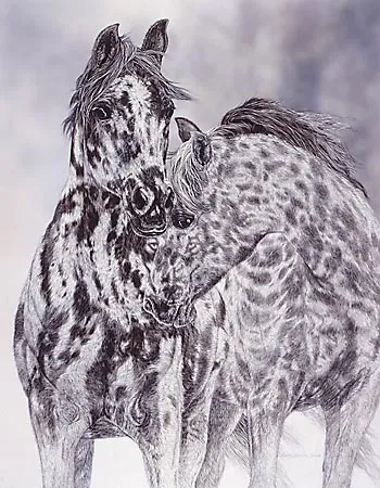 Judy Larson always knew she was going to be an artist. She was surrounded by them as a child, and was particularly inspired by her father, a professional illustrator. Judy received a Bachelor of Science degree in Commercial Art from Pacific Union College in Northern California, then spent the next 17 years as a commercial artist, illustrator and art director. In 1988, influenced by her love of nature and animals, Judy devoted her time to wildlife art. Her primary focus in each of her paintings is the animal, with the horse as a recurring subject. Her unique approach to her work is through the use of scratch board--a technique that can render magnificent detail but one requiring infinite patience. Scratch board, an old, but little used medium, consists of a smooth, thin surface of hardened China clay applied to a board. The subject is then painted solidly with black India ink to create a silhouette. Now the exacting work begins, engraving the image into the surface of the artwork. While many artists use steel nibs or engraving tools, Judy prefers to work with X-acto blades, changing them ever few minutes to produce as fine a line as possible. Once the subject has been totally scratched, it is a finished black and white illustration, ready for the artist to add color. The methods of adding color are diverse. Judy prefers a combination of airbrush, gouache or acrylics for finishing, with frequent rescratching for detail. Scratch board is a demanding medium, one that Judy has used masterfully in developing her unique approach to wildlife art.