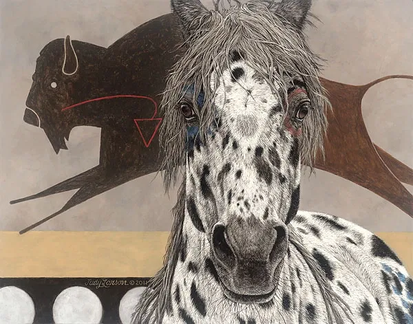 A hunter’s wife would paint a symbol on the horse that represented her secret prayer to the Great Spirit for her husband on the hunt. If the man was not yet married, his mother would paint that symbol. If the hunt was successful, that symbol would most likely be used again. Judy’s hidden spirit, a buffalo head, symbolizes her hope for this warrior’s safe and victorious hunt.