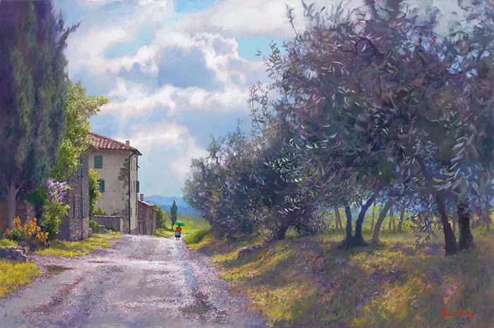 "The little farmhouse in Pennsylvania where I grew up was always alive with singing, laughter and a love of the arts. My father, a voice instructor, introduced us to the steady flow of eccentric, larger-than-life characters found in his greatest passion – the dramatic world of the Italian opera. Aida s rich theme always seemed to be playing in the background as I went in search of a reality I could call my own, escaping into the quiet roar of the singing crickets and song of the meadowlark. I could lose myself in the turquoise twilight magic of a summer evening or breath of sweet fields of winter wheat beneath the rising sliver of a moon. I found my true love and years later found myself longing for the beautiful fields of my childhood, where everything was the way it should be. My passion springs forth through the beauty of the fertile earth, which has always been my real teacher. I began painting full time in 1982, doing my time as a starving artist while raising my young son. I was happy to trade this tragic cliché for the happy success of sell-out gallery shows and award banquets. In 1991, I married maritime artist David Thimgan, and we thrived together. On one late summer afternoon escape, traveling to the Mendocino coast, I discovered the California wine country. I was so happy to have found a place in California that reminded me of my long lost fields of Pennsylvania. I painted my first vineyard scene in 1996 and, as time passed, this interest has taken me to the countryside of Tuscany, where I feel I probably lived in a former lifetime. My Italian opera theme song has never left my heart, and somehow life seems to have come full circle, to connect, again, the passions of my life. "