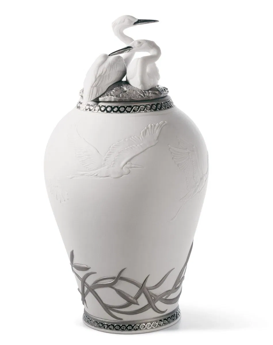 Lladro Herons Realm Covered Vase Figurine Silver Lustre Porcelain Figurine 01007052
