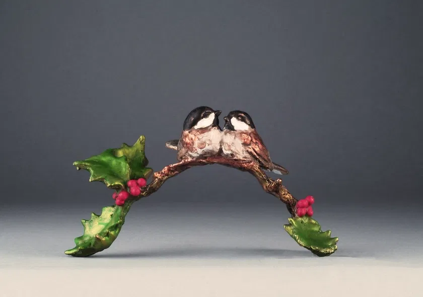 Two friendly little chickadees have landed amid bright holly leaves and berries, cuddling close to keep each other warm..