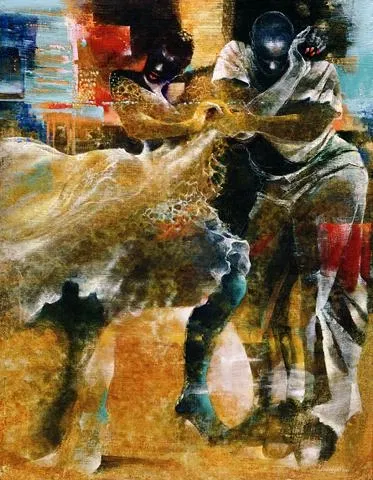 Thanks to television and movies, millions of people see the works of Paul Goodnight and don't even know it. You could be watching Will Smith in "Fresh Prince of Bel Air," "Seinfeld," "ER" or the award-winning movie "Ghost," and at some point, you will probably notice his distinctive paintings on the walls. Goodnight has developed his own unique aesthetic philosophy to document the humanity of people around the world, often incorporating African themes and symbols to provide depths of history and culture. For his ability to capture these elements and integrate them with sport, Goodnight was selected as the American Sport Art Museum and Archives' 1997 Sport Artist of the Year. Goodnight has developed a strong and influential following. Former Detroit Pistons point guard Isiah Thomas and actor Wesley Snipes are just two frequent buyers of Goodnight's work. He routinely sends pieces to the Hollywood Cinema Arts where TV and movie set designers choose artwork for productions. His first break came in 1982 when a print was selected for "The Cosby Show" and he continues to receive acclaim and recognition today. This African-American artist, who specializes in ethnic images, never had it easy. Traumatized by two years of fierce combat in Vietnam, Goodnight returned home mentally devastated. It wasn't until he looked to his childhood passion of art that he turned the corner to recovery. His hobby quickly turned into a profession after he received his degree from the Massachusetts College of Art in 1976. His creative efforts are nurtured and inspired by several artists. Today, Goodnight continues to interact and correspond with master African American artists and mentors, John Biggers and Alan Rohan Crite. Through the years, he has developed his own unique aesthetic philosophy to document the humanity of people around the world. His African themes and symbols provide a one-of-a-kind depth to history and culture. He has contributed much to the athletics arena of art, most notably in 1996, when he created "Feet Don't Fail Me Now" to commemorate the Centennial Olympic Games in Atlanta. Goodnight has studied and he travels extensively to different parts of the world, living among the people of Russia, China, Haiti, Nicaragua, Africa and Brazil. It is during one of these travels to Senegal that the artist said he learned the meaning of black beauty. Goodnight finds that galleries are hesitant to show his ethnic images, focusing instead on the more classical Eurocentric works. Today, he continues to work in a variety of media, including acrylics, pastels and mixed media.
