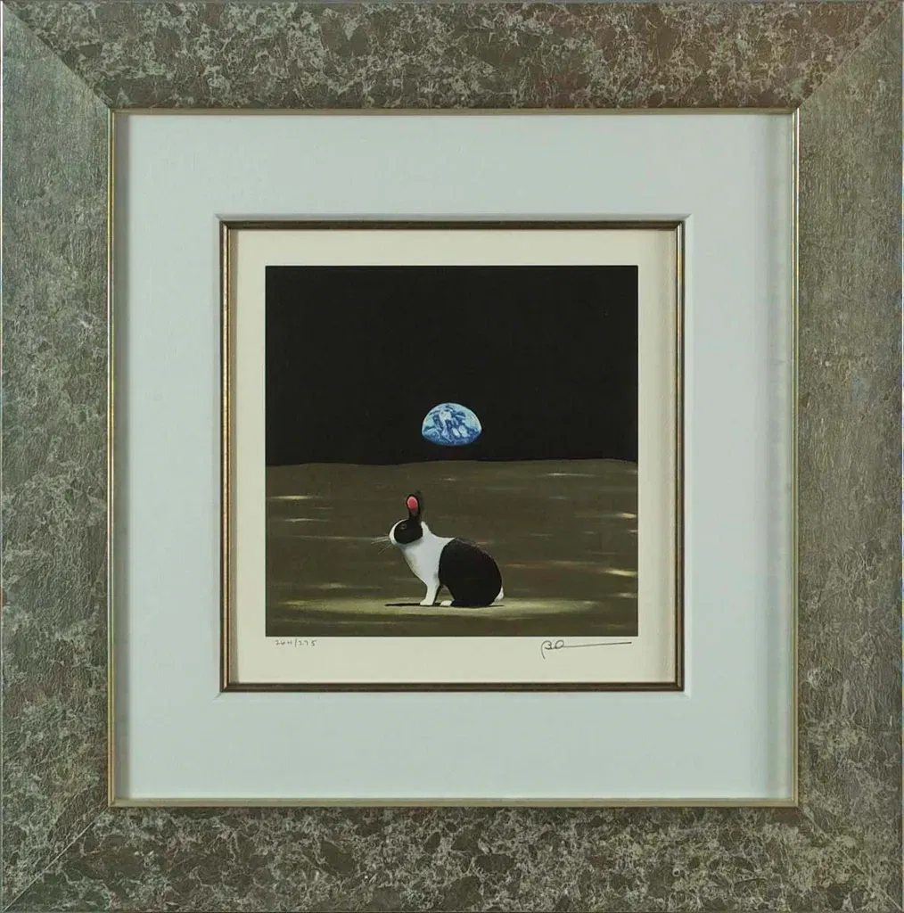 Robert Deyber A Hare Out of Place I Outer-Space Framed hand-crafted stone lithograph