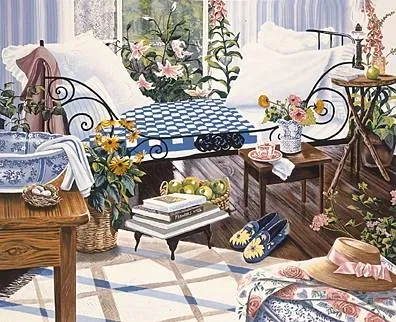 Serene settings, gentle harmonies, soft, inviting rooms, lush, floral gardens, quiet seas that evoke tranquility - artist Susan Rios' distinctive style is evident in every image she paints. We are drawn in by the love and peace depicted in each painting, uplifted both visually and emotionally. It is as if Susan has personally invited us into her private places, allowing us to linger there, partaking of the scene. “There are stories in most of my paintings, and often, the piece will speak of what is going on in my own inner world. I add elements to complete the memory of the dream or the moment. People often say that there is something that feels familiar when they see my work. I think what they may be responding to is the emotion a painting will evoke and there is a familiarity about that. We all share so many of the same feelings.” Susan resides in Southern California, amidst rooms very reminiscent of the images she paints. Many aspects of Susan’s world are subjects in her paintings, including her daughter, Olivia and granddaughter, Rose, her dog, Annie, as well as her furniture, collectibles, pillows, and ever-present bouquets of flowers from her year-round gardens. Nowadays, Susan’s love of art has evolved to include teaching and mentoring, with students ranging from children to seniors, from first-time novice to experienced artist. Her encouraging style brings out the best in everyone, and no one is more delighted than Susan herself as she views the remarkable paintings rendered by budding protégés. "It's truly the most satisfying thing to help people evolve with their creativity and watch them become more confident as their work gets better and better." Susan is a rare blend of sensitive artist and practical businesswoman who has built businesses from the ground up with integrity and a commitment to her collectors. Susan Rios Designs now offers a full line of canvas prints, embellished one of a kind prints, cards, miniprints, jewelry, and of course, Susan Rios original paintings.