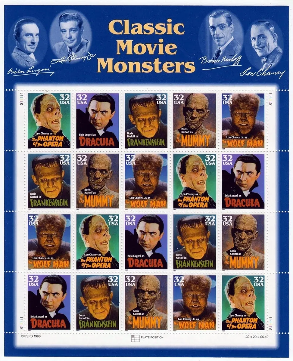 Collector's sheet issued by the USPS in 1997 commemorating FIVE CLASSIC MOVIE MONSTERS: Dracula; Frankenstein; The Mummy; The Wolf Man; and The Phantom of the Opera. Monster portraits are of the classic stars (in make-up) who portrayed them. - 900050 NOTES: . Classic Movie Monsters   by Thomas Blackshear  Image Copyright © 2025 by Thomas Blackshear