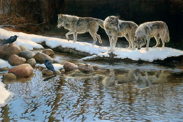 “In this image, the ravens are leading a small group of wolves to a kill they have discovered. I love this painting because it is as much about the relationship between the wolves and the crow as it is about the lighting and rhythm of the composition. The reflections on the water and the backlighting on the wolves worked out very well. It’s a cold, but very soothing piece.”
